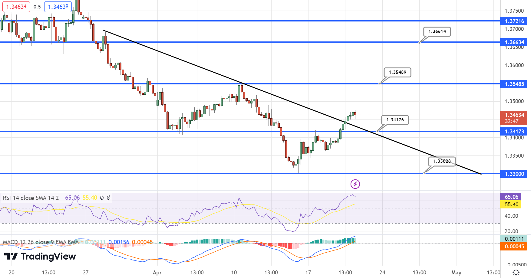 USD/CAD is up 0.06% in 24 hours, trading at 1.3468. According to futures prices, there is an 85.7% possibility that the Fed will increase interest rates by 25 basis points at its meeting on May 3.