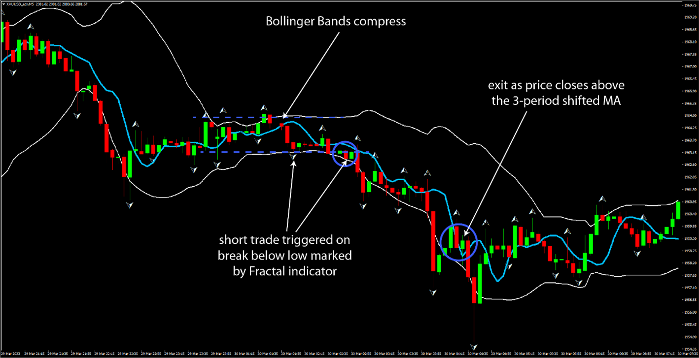 In bearish cases, it’s the opposite. We are watching the down-pointing arrows of the Fractals indicator. A break of the price below this arrow is the trigger for a short trade. The Bands will expand as the price breaks out of the range.